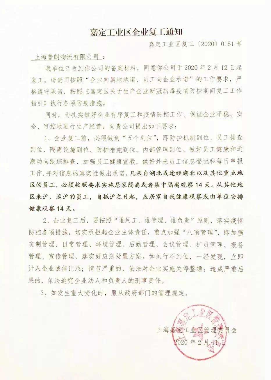 不同于大部分企業,普朗物流因擁有完善的管理體系和制度,以及上海市的復工審批制度,使得普朗物流在疫情期間,在完全遵守防控政策與守則的前提下,得以開工!